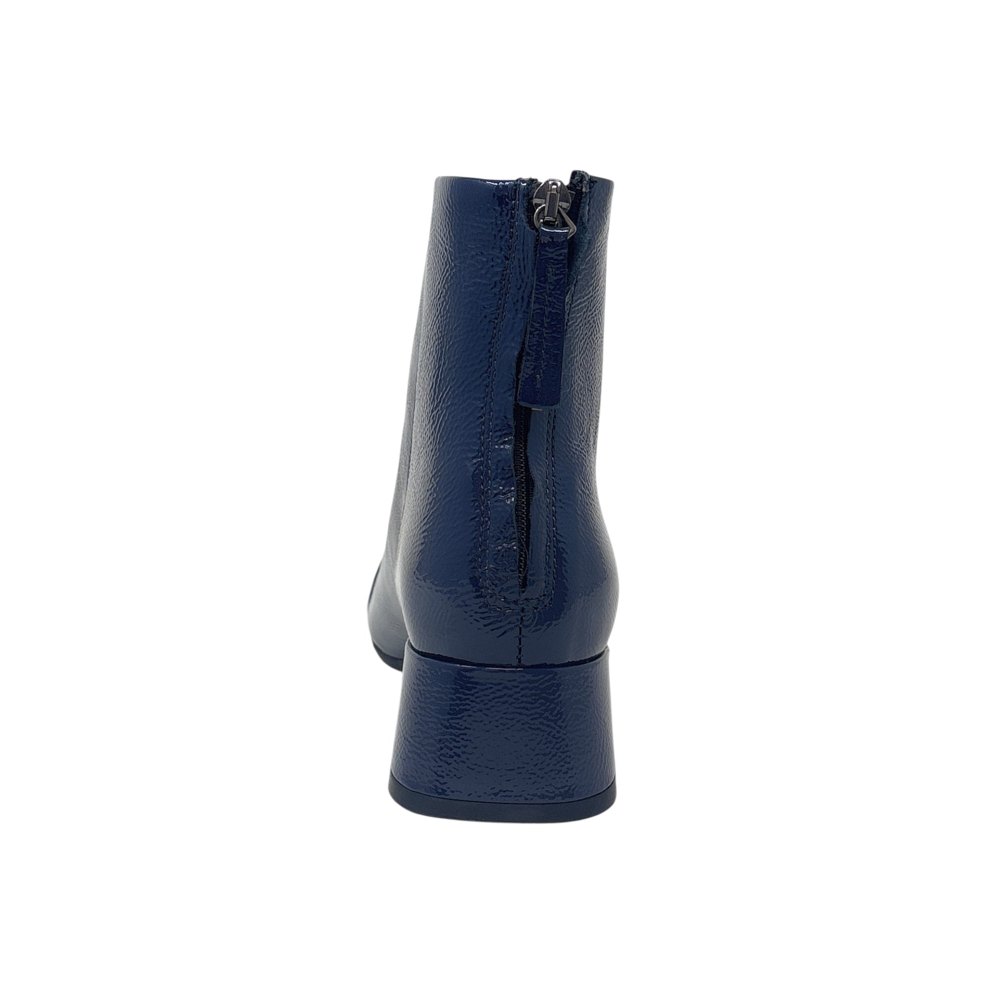A square toe and chunky block heel balance a rich patent leather bootie fitted with a back zipper for easy entry.