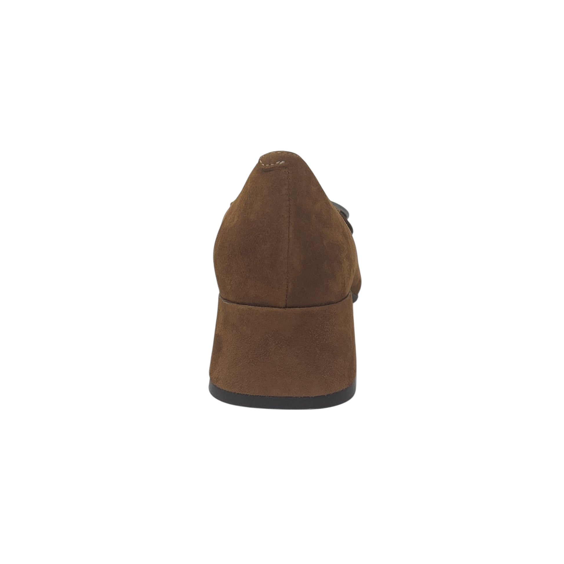 A buckle graces the apron toe of this rich suede loafer lofted on a chunky block heel with a rubber sole.