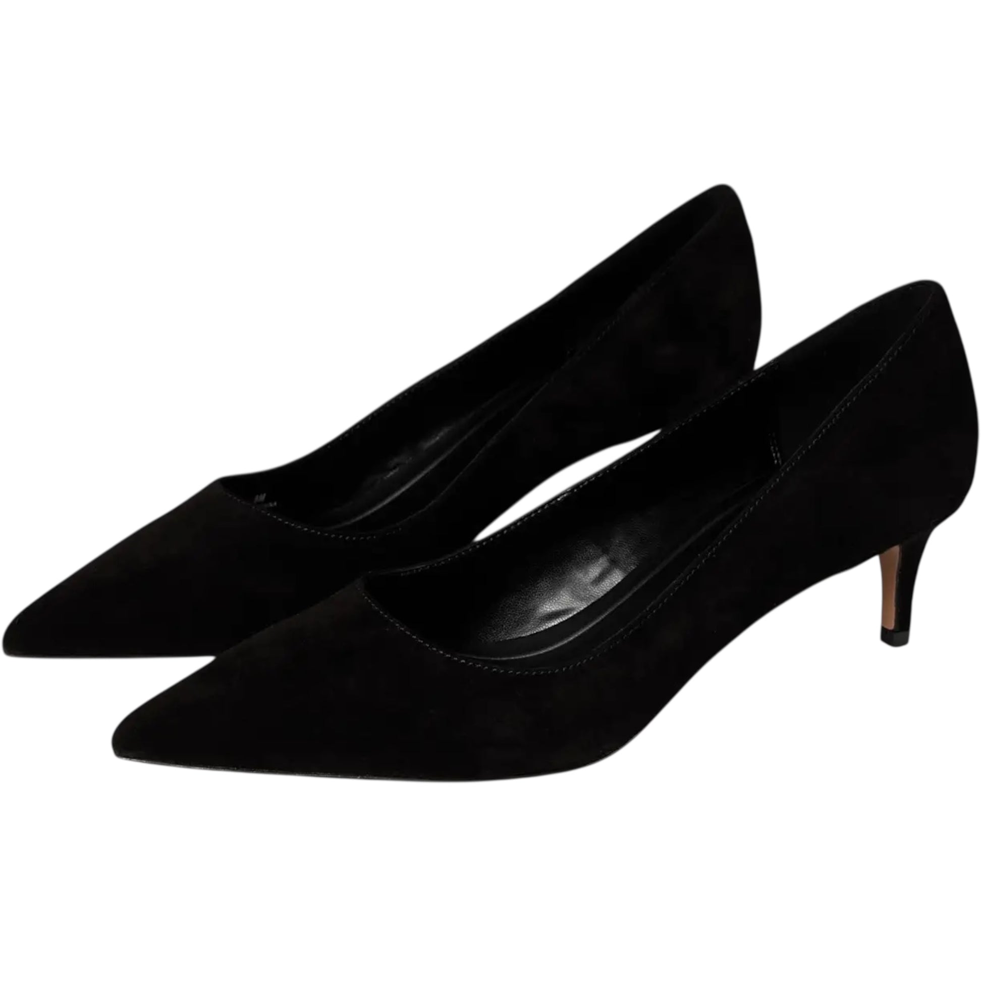 The Pelle Moda Airy heels are classic pointed-toe design pumps crafted in a rich suede. The silhouette is sleek and elegant, with a low-cut vamp that elongates the foot. These heeled pumps feature modest kitten heels that offer a refined lift while maintaining comfort. The smooth texture of the suede adds a soft, luxurious touch, making these sandals an ideal choice for both professional and dressy occasions.