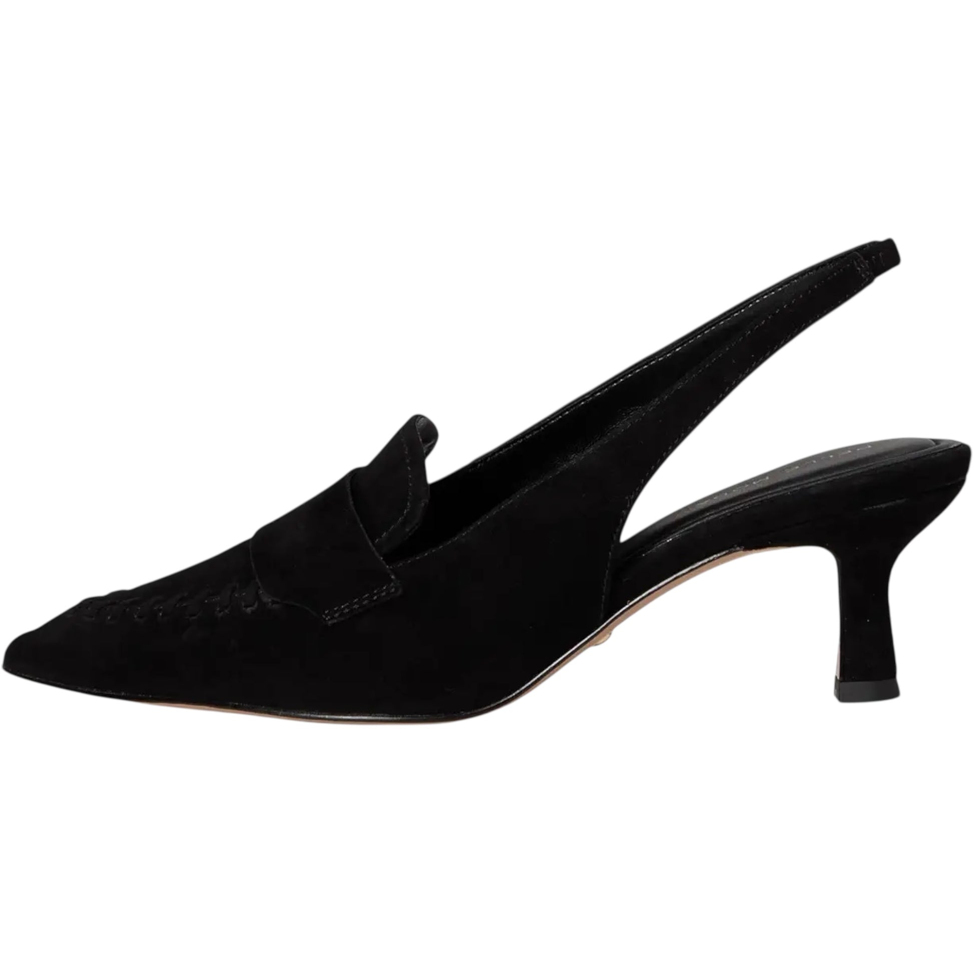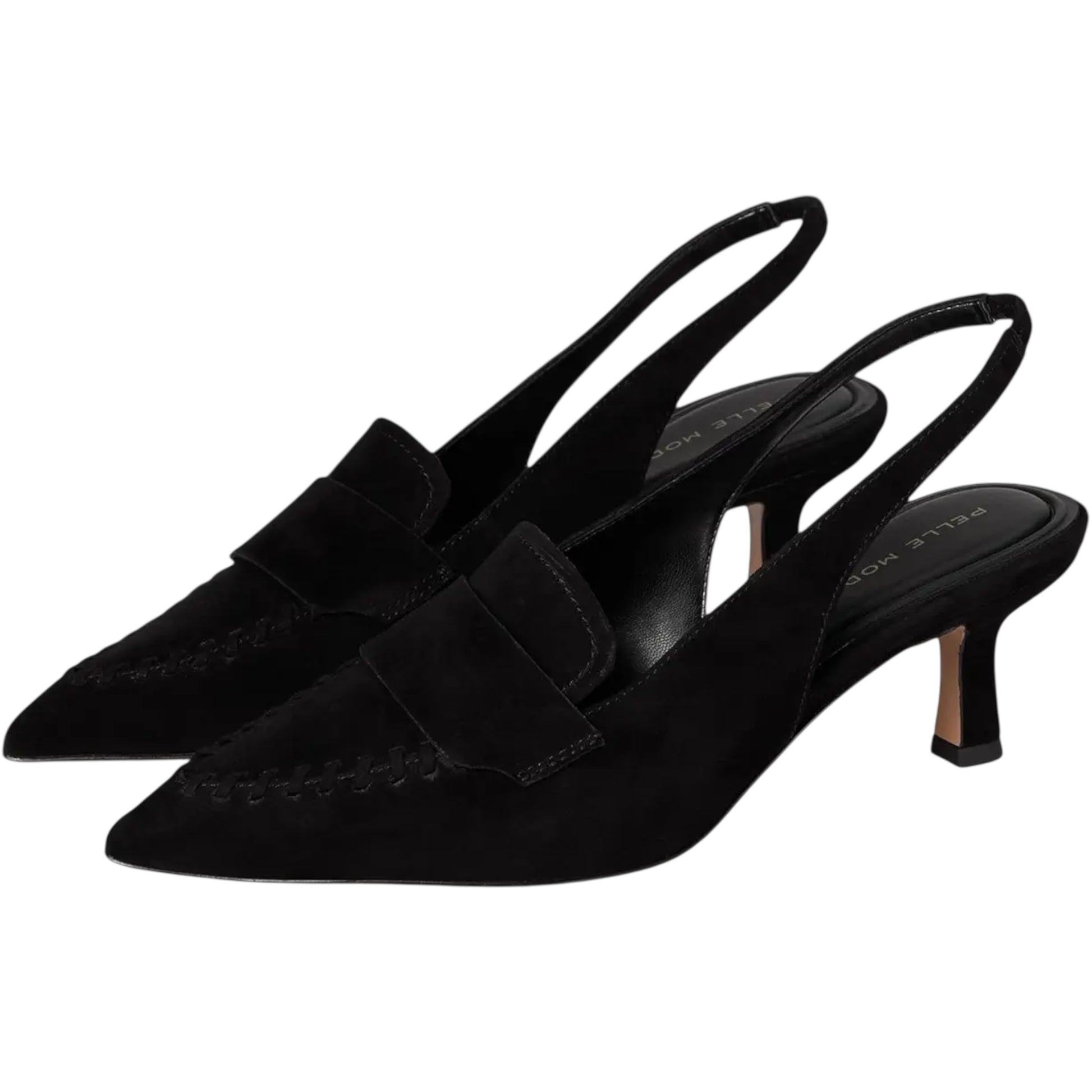The Pelle Moda Keegan is a refined slingback pump that blends loafer-inspired detailing with modern elegance. It features a pointed toe and a whip-stitched upper design reminiscent of classic loafers, adding texture and sophistication. The padded footbed ensures comfort for extended wear, while a small elastic insert covered in leather at the slingback strap provides a secure, flexible fit.