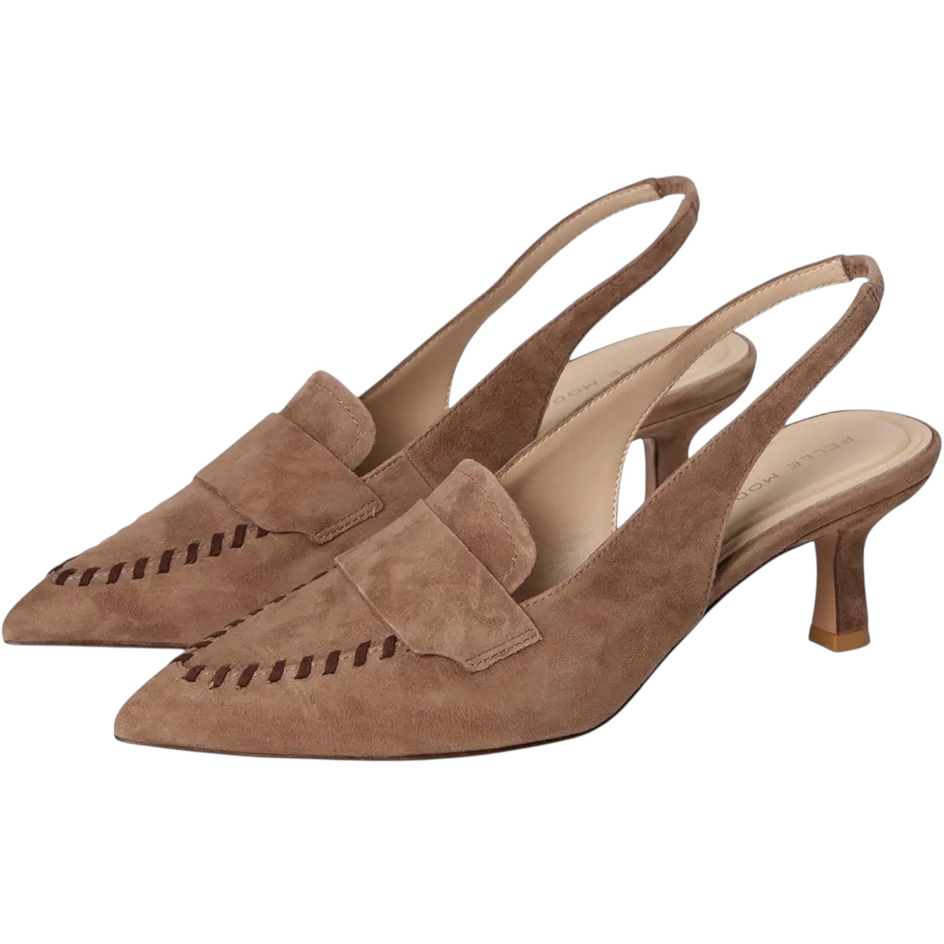 The Pelle Moda Keegan is a refined slingback pump that blends loafer-inspired detailing with modern elegance. It features a pointed toe and a whip-stitched upper design reminiscent of classic loafers, adding texture and sophistication. The padded footbed ensures comfort for extended wear, while a small elastic insert covered in leather at the slingback strap provides a secure, flexible fit.