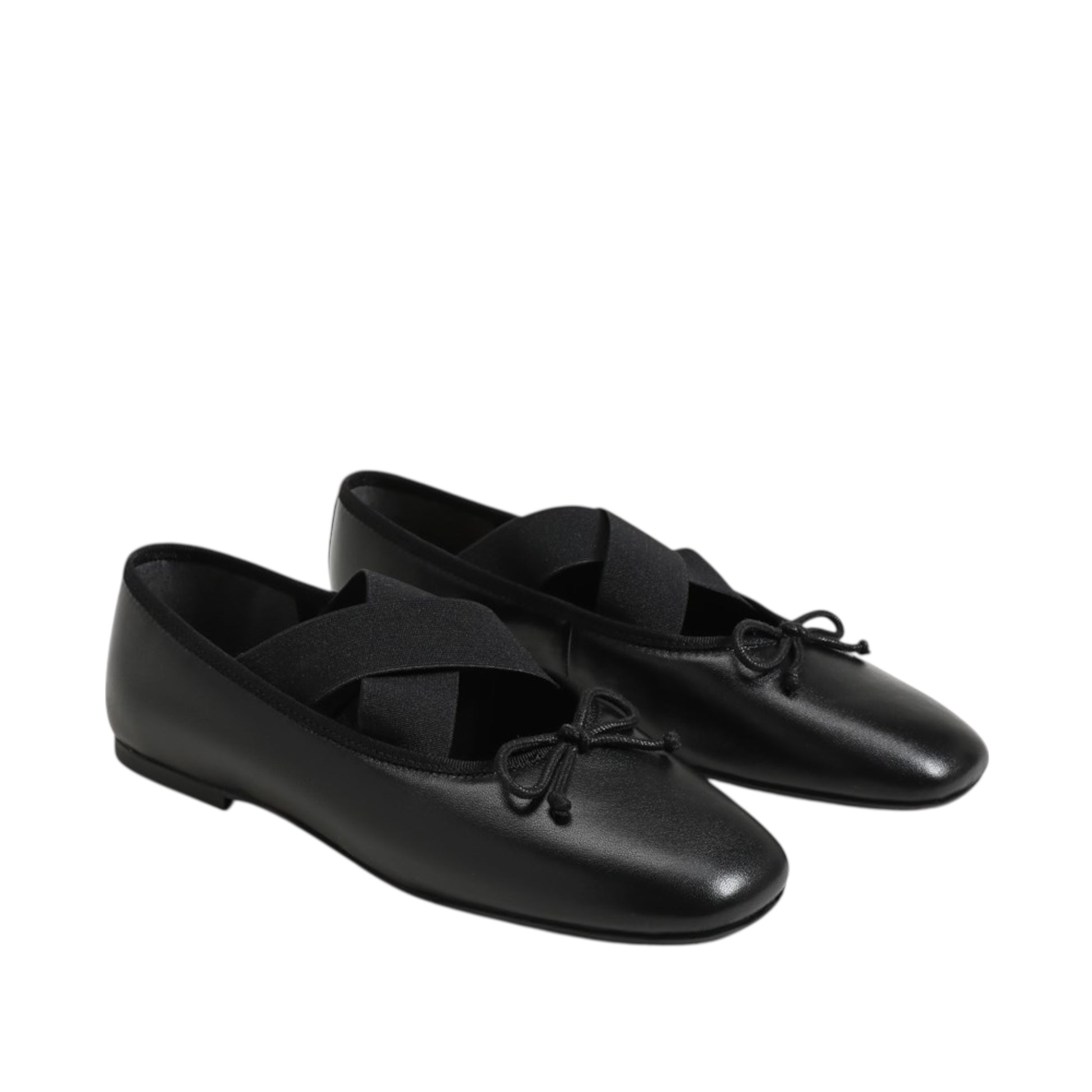 Elasticized straps perfect the fit of a classic ballet flat topped with a dainty bow.