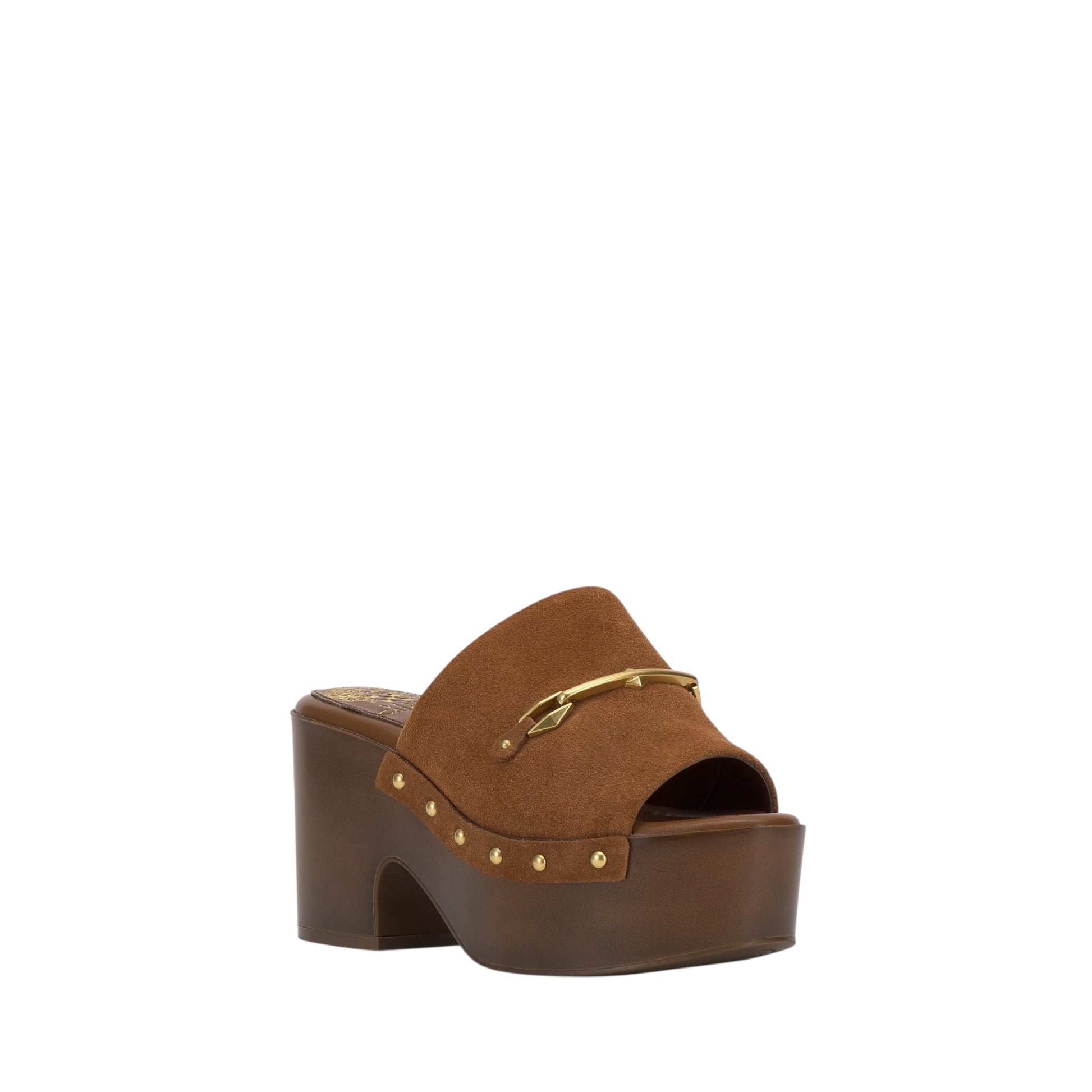 Retro clog style meets modern elegance in the Fallon platform sandal. The chunky block heel and thick platform are finished with gold-toned studs and a loafer-inspired metal bit accent across the vamp for added sophistication.